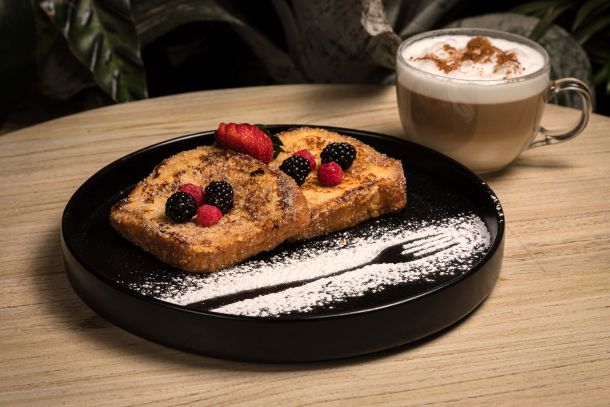 Delicioso pan brioche, acompañado de frutos rojos y canela.